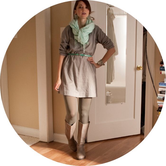 The touches of mint green in this otherwise all-gray outfit really bring it to life...